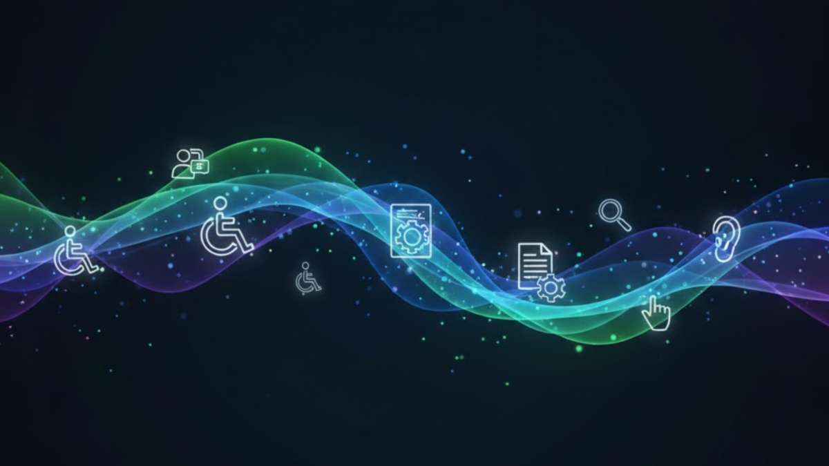 Soyut bir dijital arka plan; karanlık zemin üzerinde akan renkli dalga formu ve erişilebilirlik ile teknolojiyi temsil eden ikonlar.